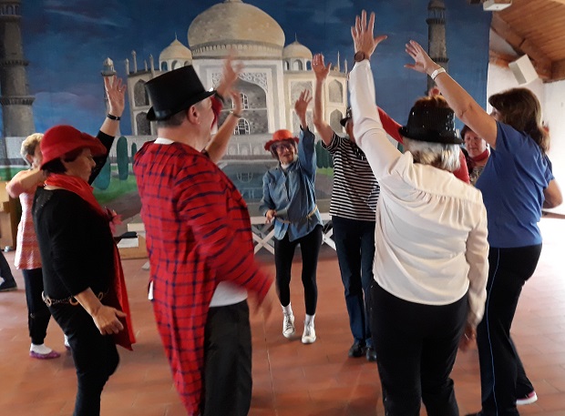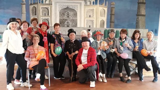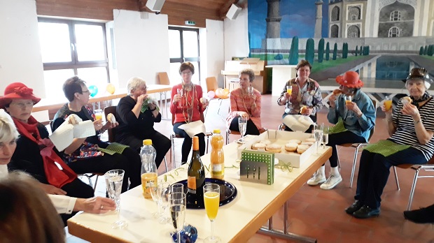 Der Pfarrheimsaal war bereits wunderbar für den kommenden Pfarrfasching dekoriert, und auch die Turner hatten sich nette Faschings-Outfits ausgedacht. So kam das aktuelle Geburtstagskind Heidi als Kaminkehrer und bekam von den beiden Vorturnerinnen Inge und Bärbel eine Rose zum runden Geburtstag überreicht (Bild rechts). Dann wurde eine ganze Weile zu bekannten Faschingsschlagern mehr getanzt als geturnt, bis es zum gemütlichen Teil überging. Da gab es dann leckere Faschingskrapfen und Prosecco serviert. Gutgelaunt machten sich alle nach knapp zwei Stunden wieder auf den Heimweg.