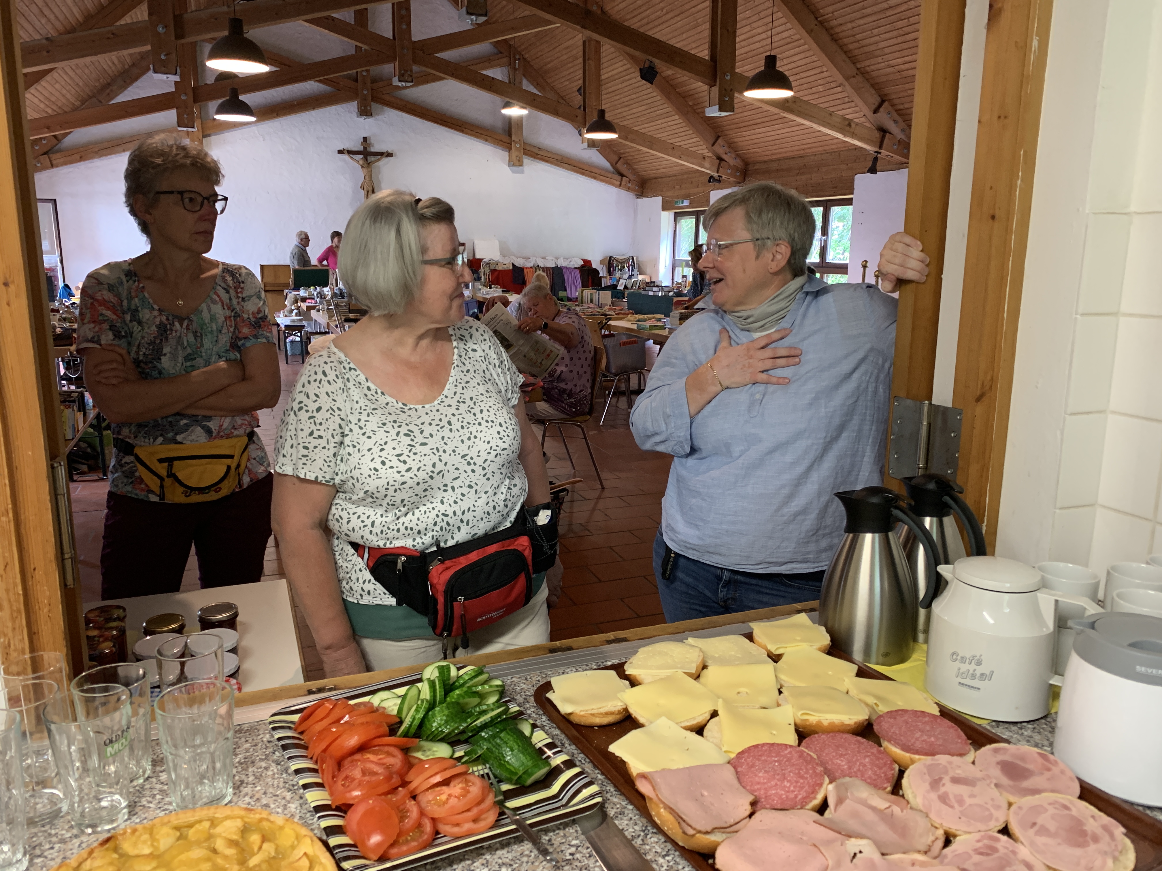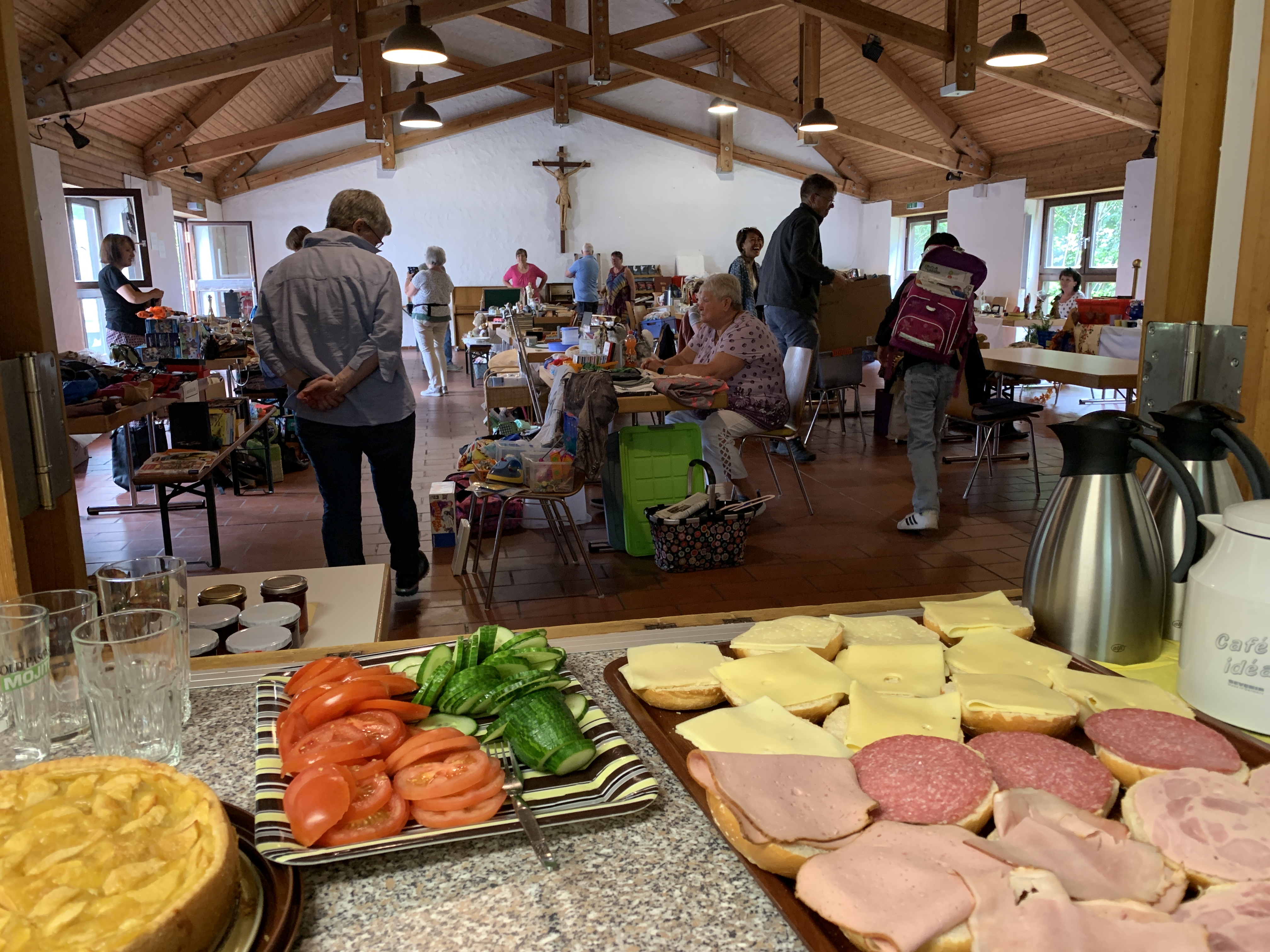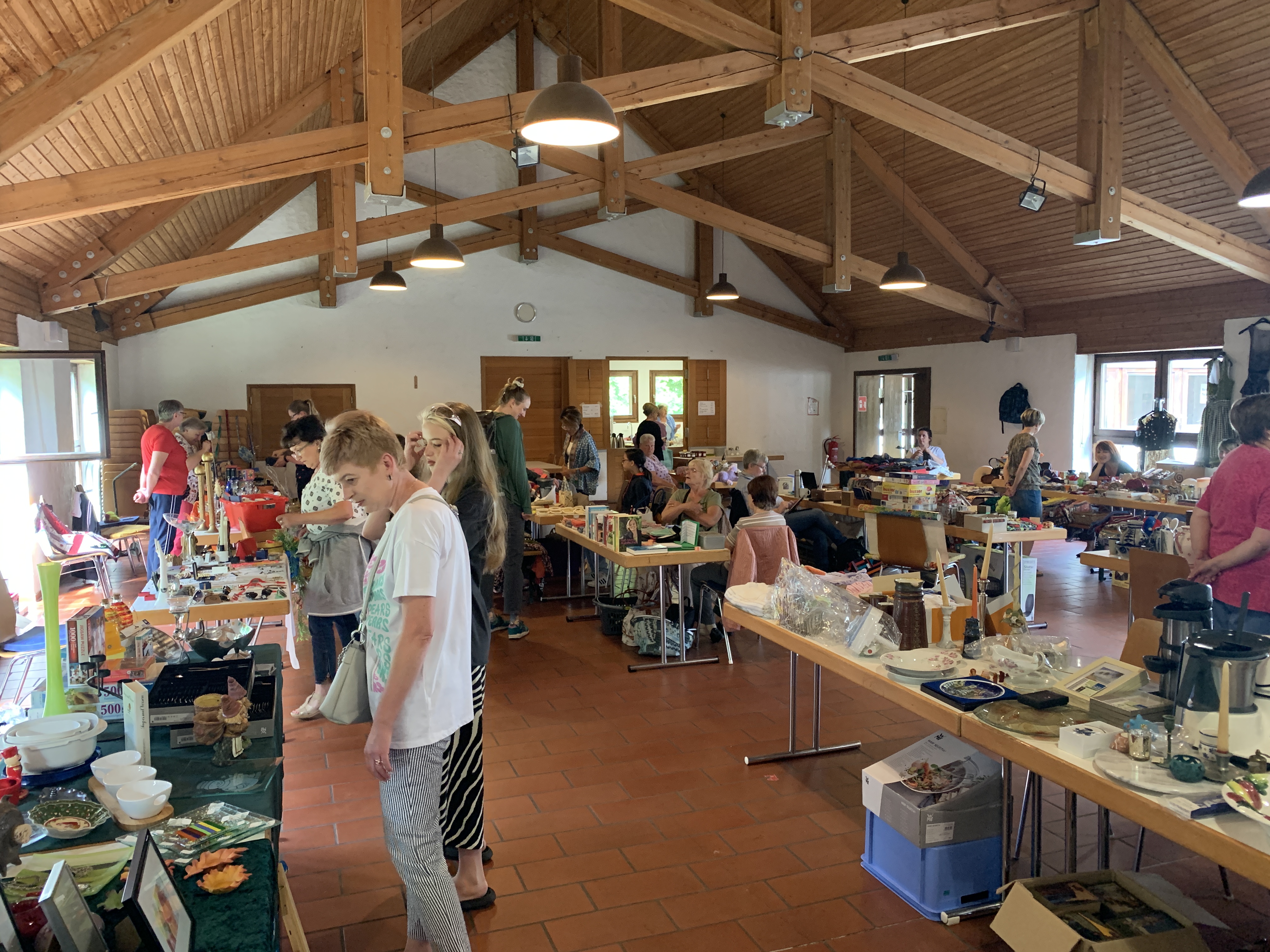 Nach den regenreichen Tagen vor der Veranstaltung am 01.07.2023 waren die 15 Verkäufer froh, dass der Flohmarkt im Pfarrheim der Pfarrei Mariä Himmelfahrt an der Gröbenrieder Strasse stattgefunden hat. Alle 21 aufgebauten Verkaufstische waren belegt.