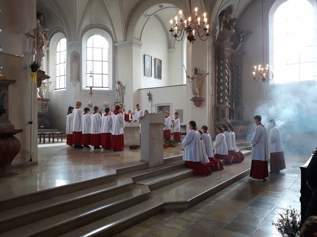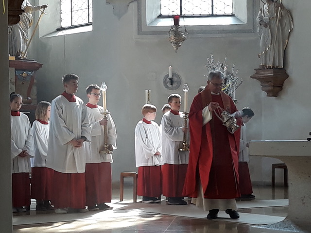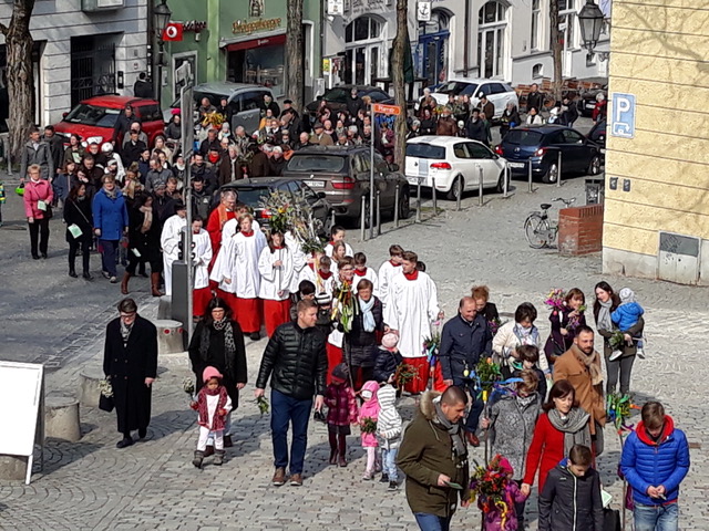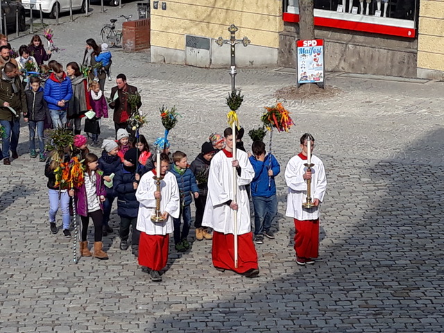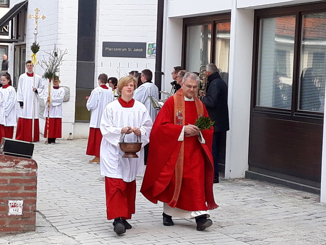 Nach der Segnung der Palmzweige und dem Evangelium vom Einzug Jesu in Jerusalem bewegte sich eine farbenprächtige Prozession zur Kirche. Festliche Musik des Dachauer Blechbläserensembles bereicherte den Prozessionsweg. Nach dem Einzug aller Kirchenbesucher und des liturgischen Dienstes durch das Hauptportal, untermalt von den mächtigen Klängen der Orgel, wurde die Leidesgeschichte in kindgerechter Form von 3 Lektoren in verteilten Rollen vorgetragen.