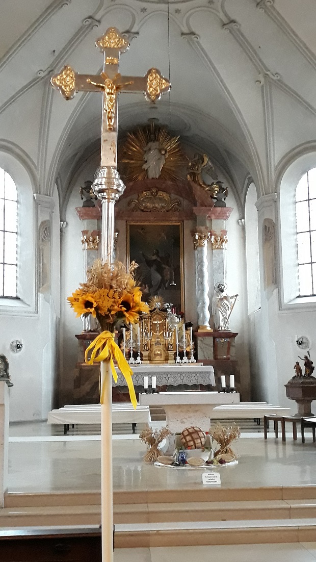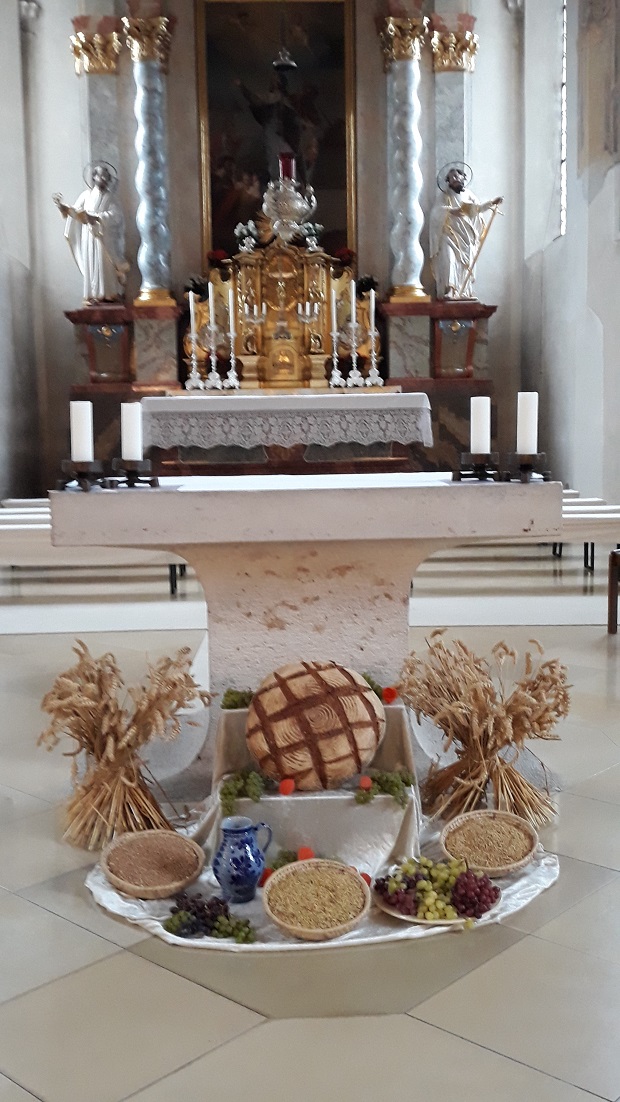 Das Erntedankfest ist ein Fest, das alle gleichermaßen anspricht. Die vielen Gaben sind mit ihrer Farbenpracht und ihrem Duft ein Fest für die Sinne. Zusätzlich lässt das Erntedankfest aber auch nachdenklich stimmen. In unserer Zeit erleben wir immer weniger den jahreszeitlichen Wechsel, den Zusammenhang von Säen und Ernten, von Wetterlage und Wachsen, von Pflegen und Gedeihenlassen. In vielerlei Hinsicht machen wir uns unabhängig von den Jahreszeiten mit ihren unterschiedlichen Witterungen. Unabhängig von der Ernte und den Jahreszeiten kann z.B. vieles das ganze Jahr über gekauft werden. Supermärkte, globale Warenwirtschaft und –lagerhaltung lassen heute fast vergessen, wie wichtig die Ernte ist. Vieles ist modern und leistungsfähig: Anbau, Bearbeitung, Ernte, Verarbeitung und Verteilung – wer denkt da noch an die Arbeit und die Mühen des Bauern und der Bäuerin? Das Wichtigste aber hat sich nicht geändert: Wetter und Gedeihen liegen allein in Gottes Hand. Davon sind wir abhängig.