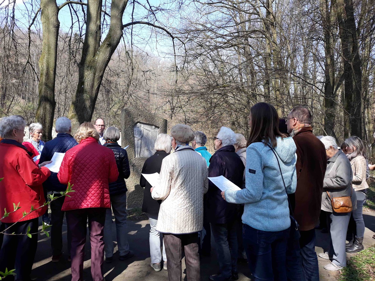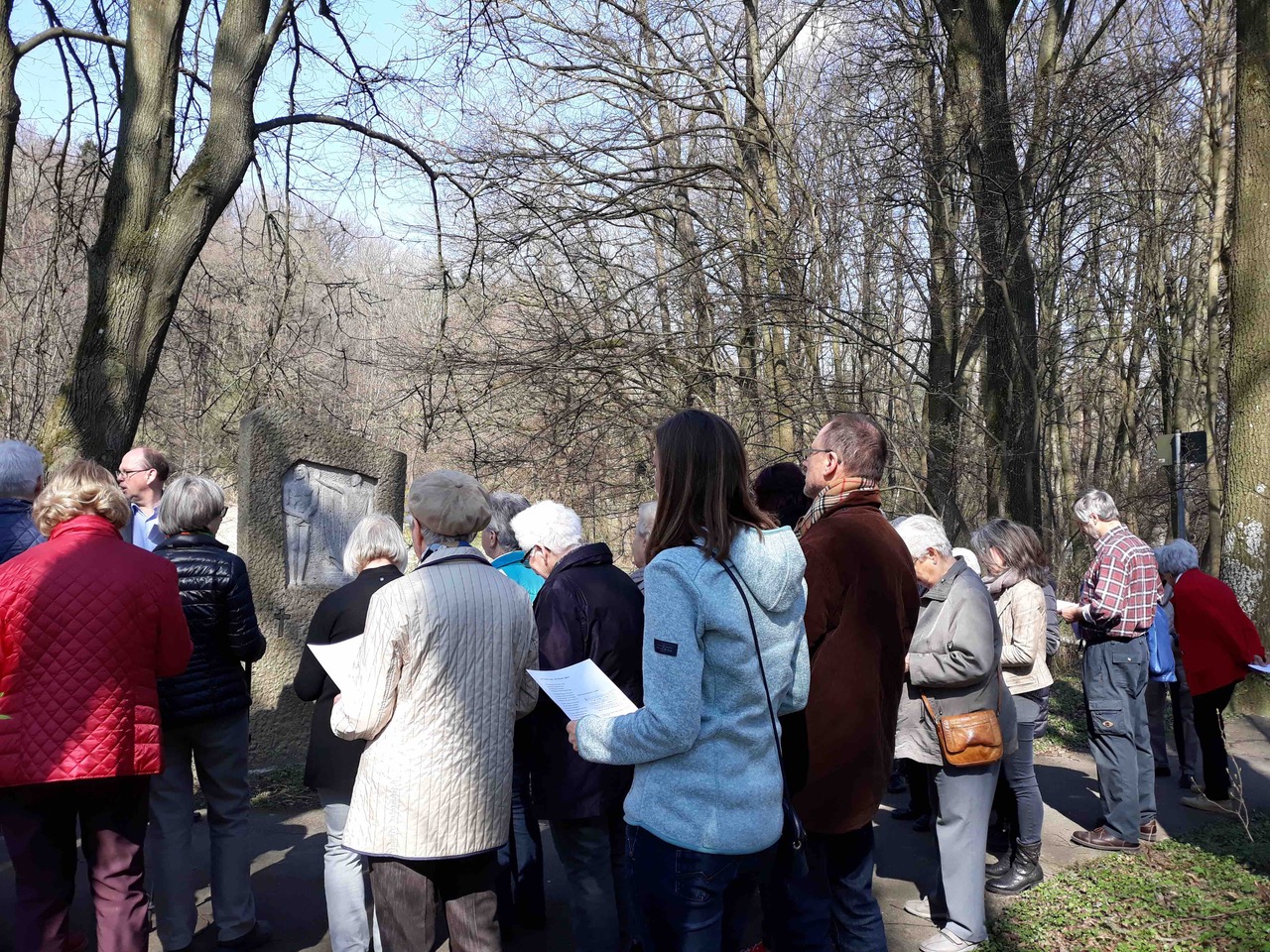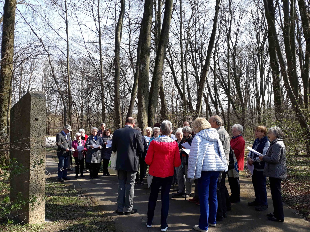 An jeder der 14 eindrucksvollen, marmornen Kreuzwegstationen trugen Beate und Wolfgang Müller passende Meditationen vor, die nach einer Fürbitte in den Liedruf: „Wir preisen deinen Tod, wir glauben, dass du lebst, wir hoffen, dass zu kommst zum Heil der Welt.