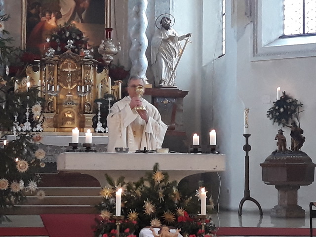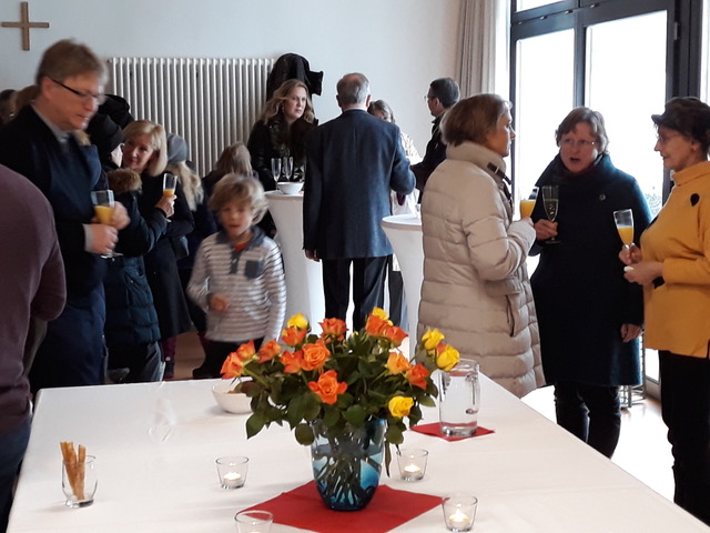 Nach dem festlichen Gottesdienst trafen sich die Kirchenbesucher zum traditionellen Neujahrsempfang der Pfarrei im Jakobussaal. Bei einem Glas Sekt wünschte Herr Pfarrer Borm allen Anwesenden ein gesundes, gelingendes neues Jahr 2019.