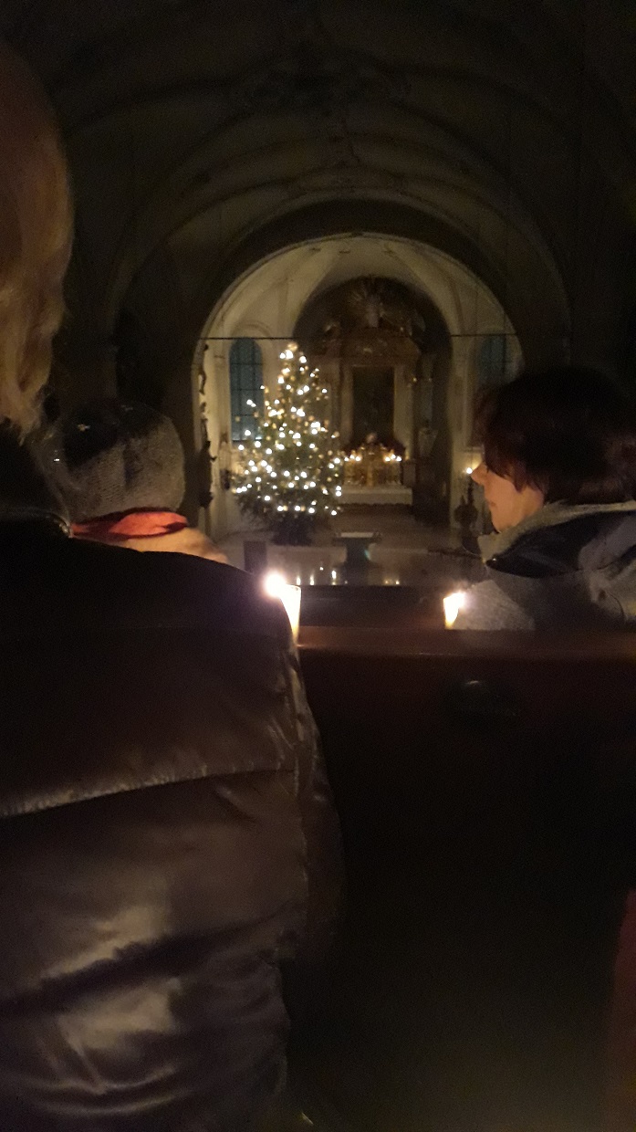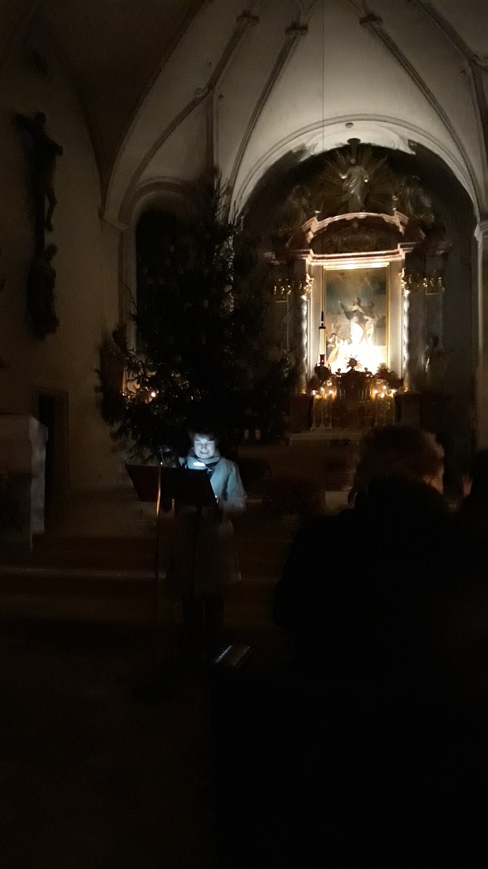 Zur letzten Station des Abends bat die engagierte Referentin alle Besucher auf die Empore. Und sogleich setzte sich eine Lichterprozession durch den Mittelgang nach oben in Bewegung. Auf der Empore angekommen, fiel der Blick aller sofort auf den festlich beleuchteten und geschmückten Christbaum links vom Hochaltar, der seit Montag eigentlich schon abgebaut sein sollte. Anni Härtl hatte den Mesner extra gebeten, den Baum stehen zu lassen. Er war Teil ihrer sehr anschaulichen und lebendigen Schilderungen des Brauchtums im Kirchenjahr. Beginnend mit dem Advent und endend mit Allerheiligen, Allerseelen und dem Christkönigsfest. Nach dem letzten Satz von Anni Härtl „und jetzt sind wir ja in der lustigen Zeit“ intonierte Christian Baumgartner als heiteren Abschluss eine Eigenkomposition in Form eines Potpourris, in dem sich so bekannte Melodien wie „O Tannenbaum“ und „Ein Prosit der Gemütlichkeit“ köstlich abwechselten. Eine Uraufführung am Ende eines kurzweiligen Abends! Liebe Anni Härtl, von dieser Stelle aus noch einmal ein bewunderndes Dankeschön für eine mittlerweile liebgewordene Tradition.