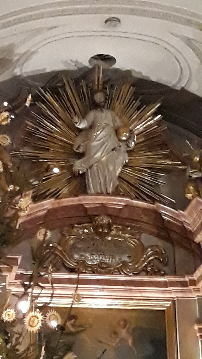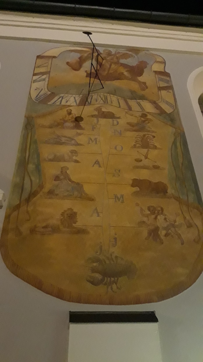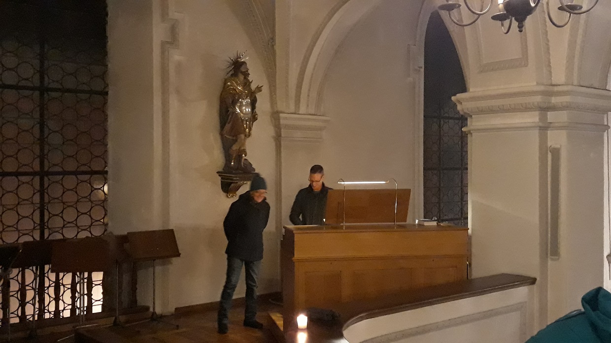 Mit majestätisch klingender Orgelmusik von J.S. Bach, passend zur Erhabenheit der Apostel, rundete Kirchenmusiker Christian Baumgartner den ersten Teil des Abends gebührend ab. Im nächsten Teil verwies Anni Härtl auf zwei große Bilder des Hl. Sebastian und Hl. Leonhard, die etwas versteckt an der Wand über der Sakristei hängen und damit ein Schattendasein führen. Bei den Ölgemälden handelt es sich um die früheren Altarblätter der Nebenaltäre, die bis 1853 im Altarraum zu beiden Seiten des Hochaltars aufgestellt waren. Sowohl beide Bilder als auch die kürzlich restaurierte Sonnenuhr von 1699 an der Südseite der Kirche stammen vom Maler Johann Georg Hörmann, der später auch Bürgermeister von Dachau war. Johann Georg Hörmann wohnte wie auch Constantin Pader in der Wieningerstraße. Feierliche Orgelmusik aus der Entstehungszeit der Bilder folgte den fesselnden Worten von Anni Härtl.