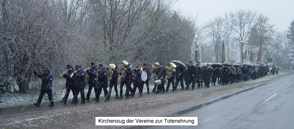Da aber die Toten der Moosbewohner auf dem Eschenrider Friedhof ruhen und die Vereine sich weigerten, diese Maßnahme anzunehmen, einigte man sich mit Pfarrer Eicher, den Volkstrauertag für die Vereine auf den Totensonntag zu legen. Auch heuer lief dieses feierliche Zeremoniell wie in all den Jahren zuvor ab. Treffpunkt war an der Gaststätte "Kreuzhof", wo sich der lange Zug der Vereine formierte und mit den Ampermusikanten Bergkirchen an der Spitze Richtung Filialkirche "Zu Unserer Lieben Frau Im Moos" in Bewegung setzte.