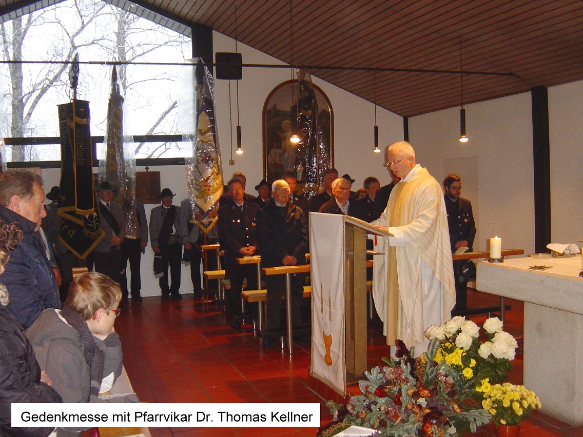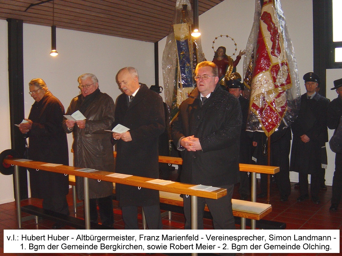 Insgesamt 8 Fahnenabordungen aus 10 Vereinen und mehrere Mitglieder derselben bildeten ein imposantes Bild in der überfüllten Kirche, wo Pfarrvikar Dr. Thomas Kellner die feierliche Gedenkmesse zelebrierte. Auch der 1. Bürgermeister von Bergkichen Simon Landmann, sein Amtsbruder, der 2. Bürgermeister der Gemeinde Olching, Robert Meier, sowie Altbürgermeister Hubert Huber und Vereinesprecher Franz Marienfeld, wohnten diesem Ereignis bei.