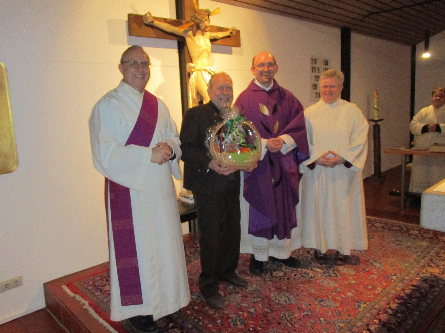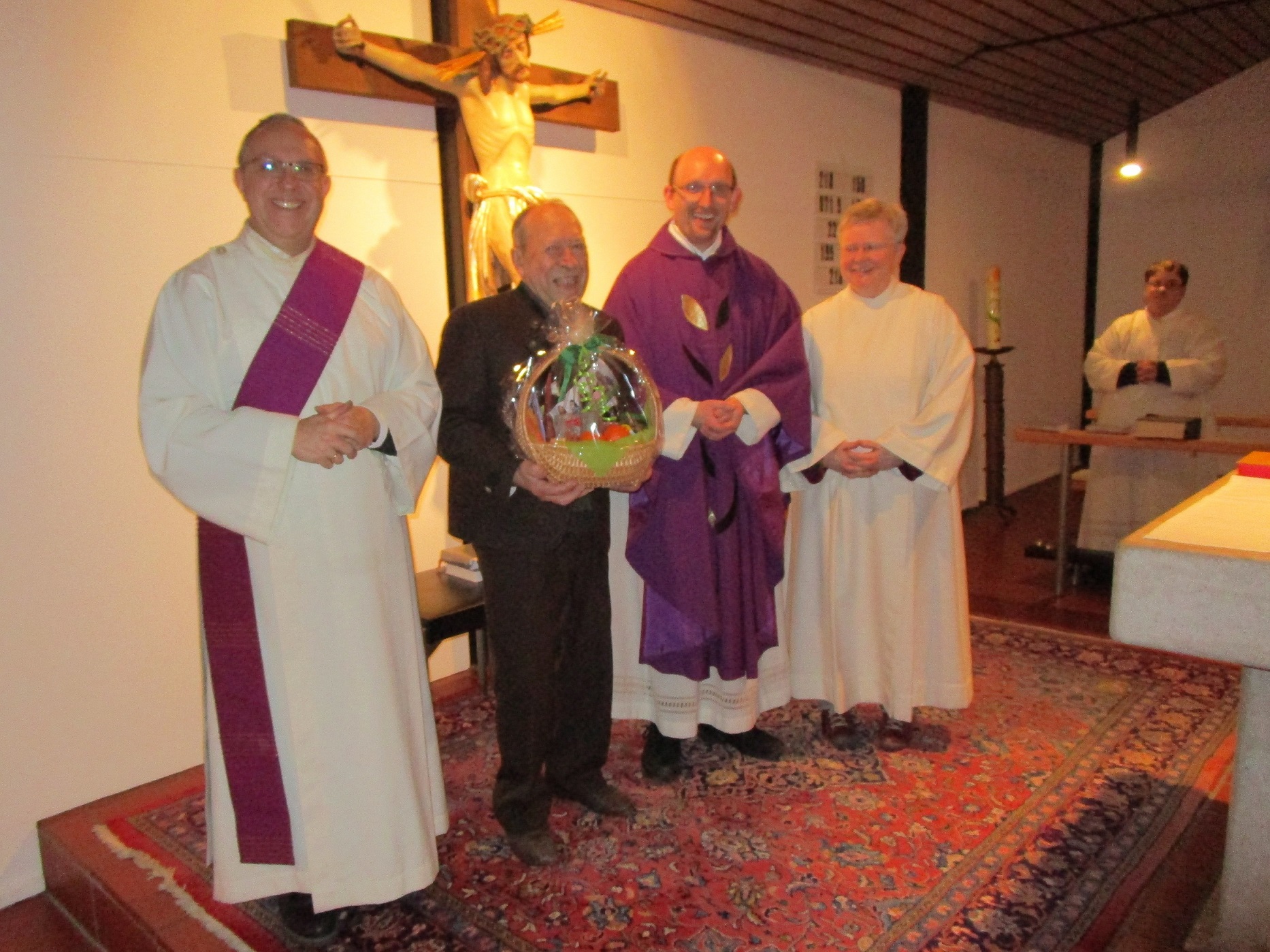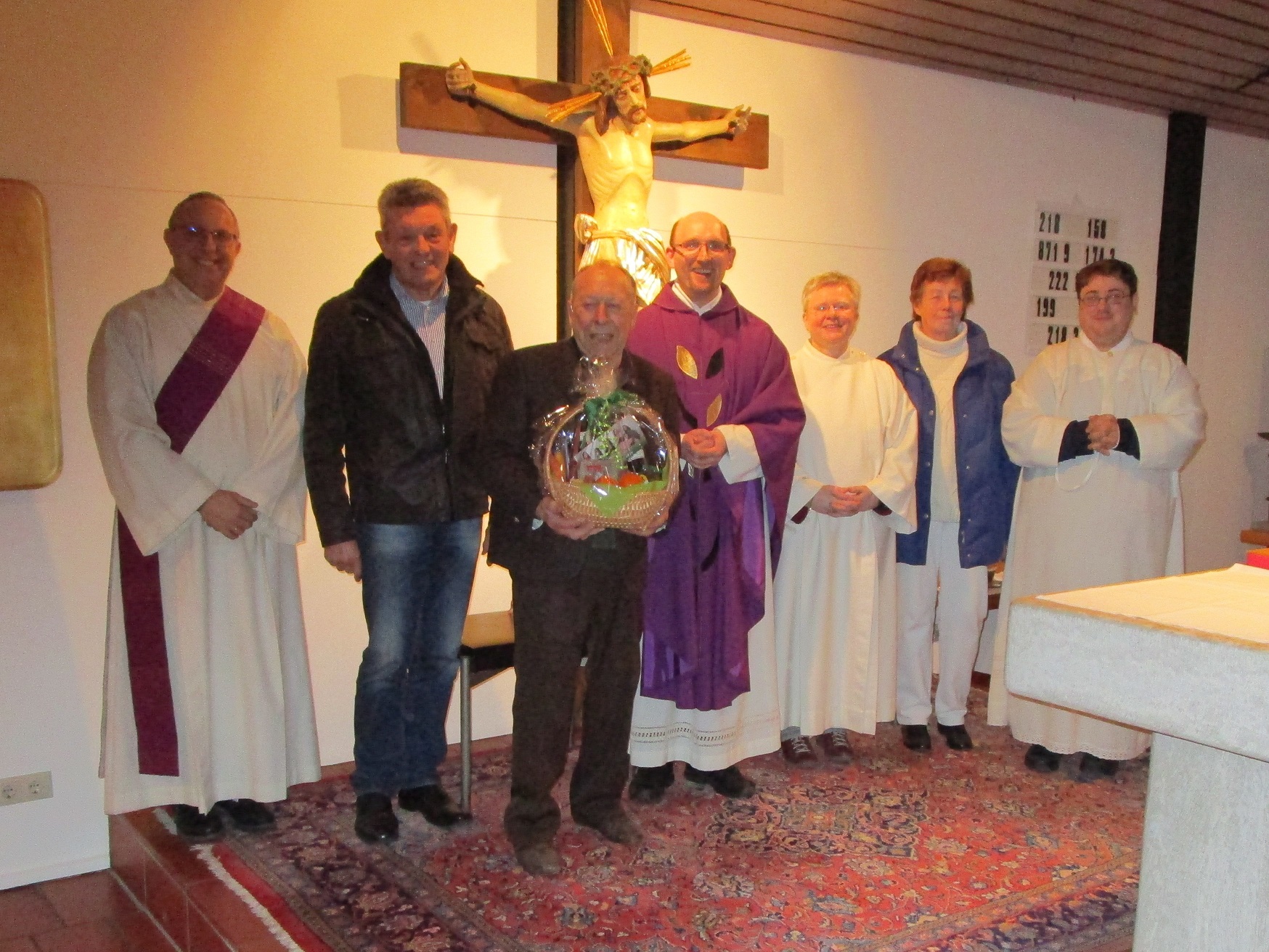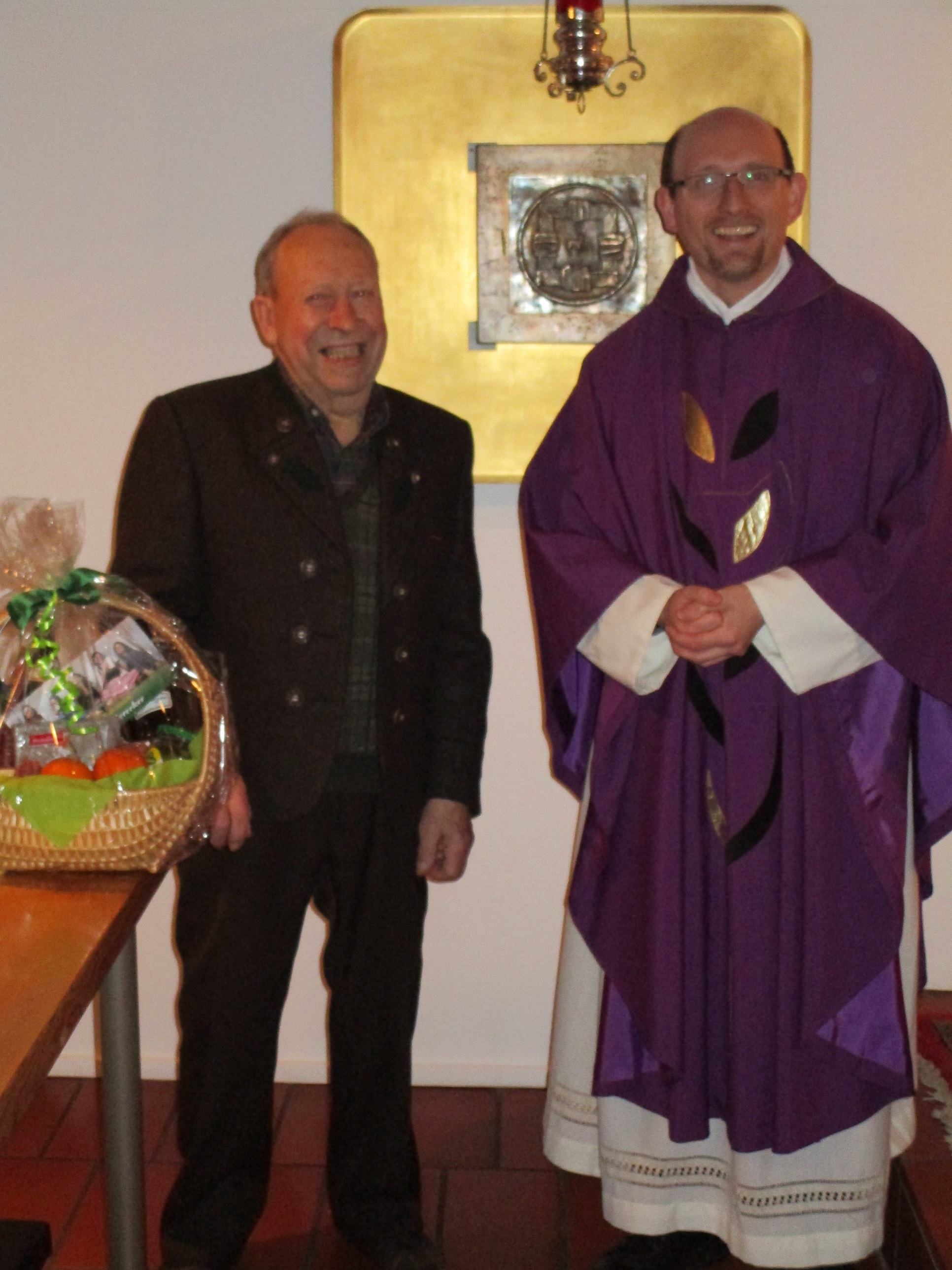 Bereits in der Predigt ließ der Geistliche das langjährige Wirken im stillen Hintergrund des mittlerweile 86jährigen Mesner anklingen. Herr Trieb bekleidete zunächst 45 Jahre lang den Mesnerdienst in seinem Heimatort Dünzelbach, bevor er das Amt in Eschenried übernahm. Am Ende der Messe würdigte Pfarrer Dr. Gnan Herrn Franz Trieb für seine 25jährige Tätigkeit in der Filialkirche Eschenried und überreichte ihm als Dank für seinen unermüdlichen Einsatz eine kleine Anerkennung in Form eines Geschenkkorbes mit Gutschein. Mit Applaus bedankten sich auch die anwesenden Kirchenbesucher.