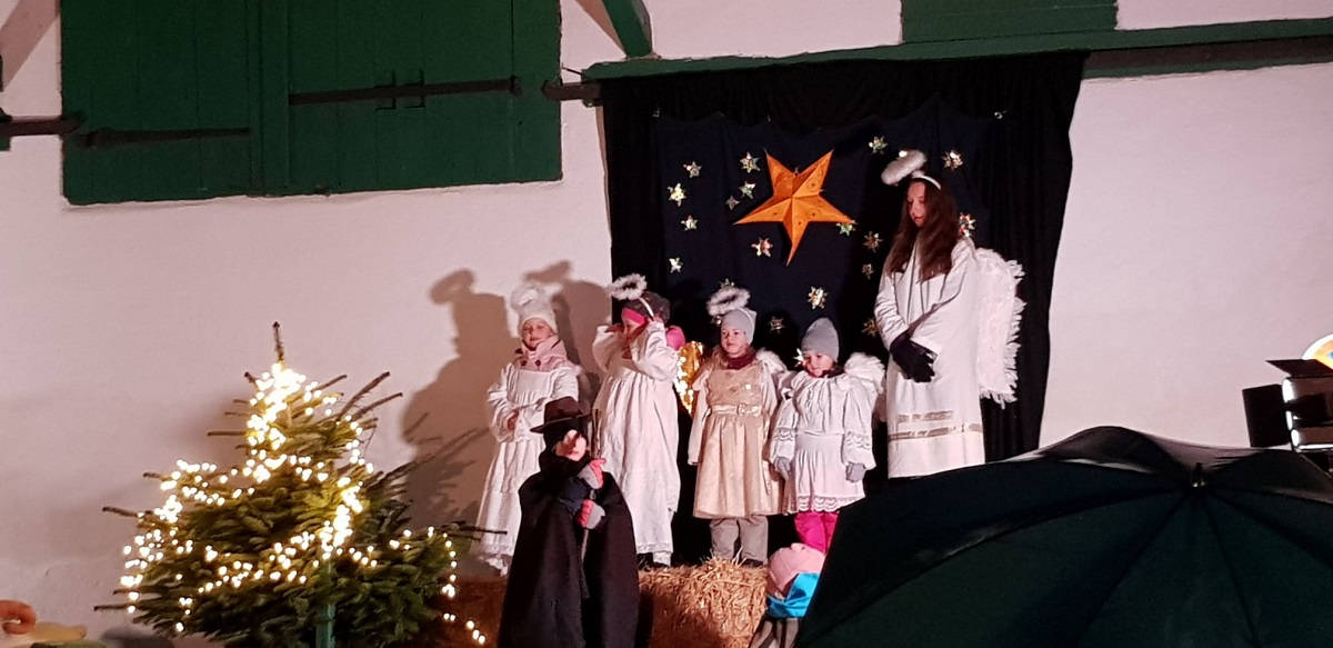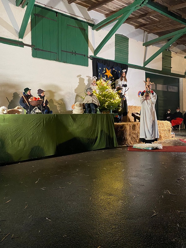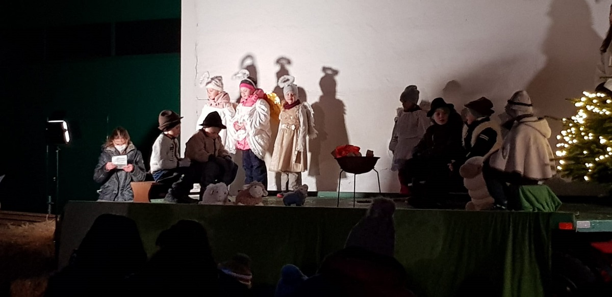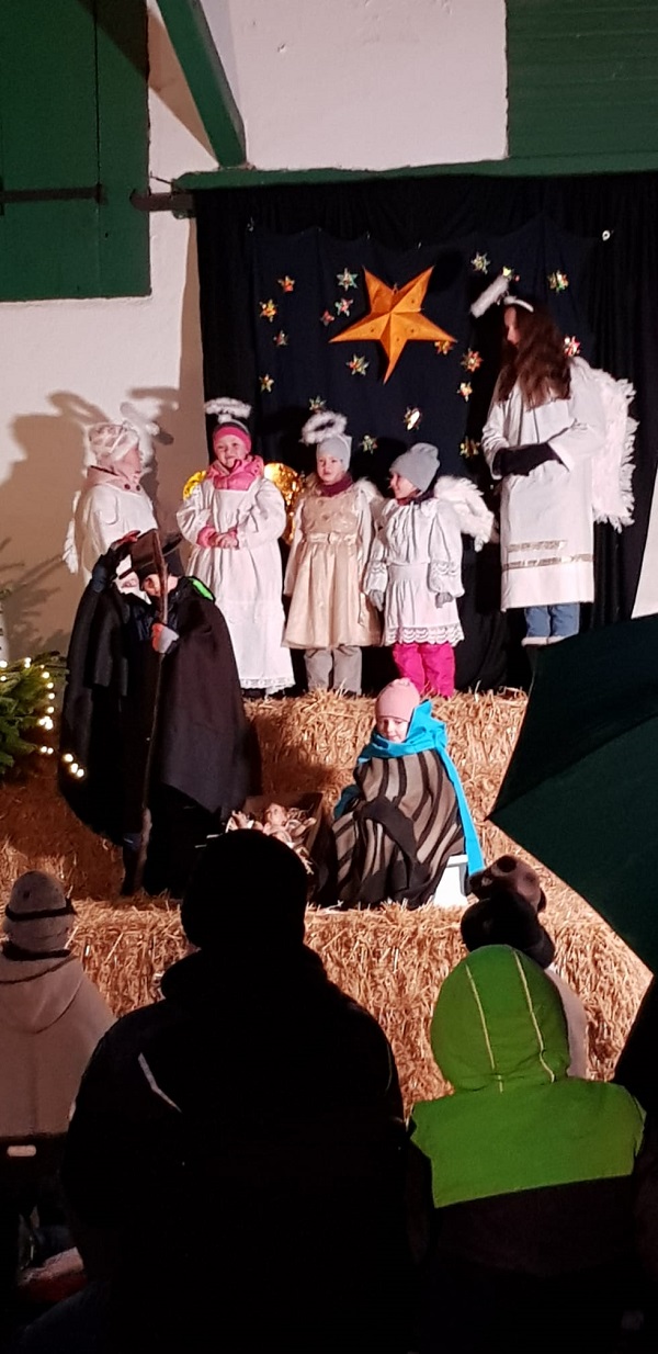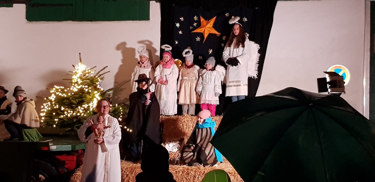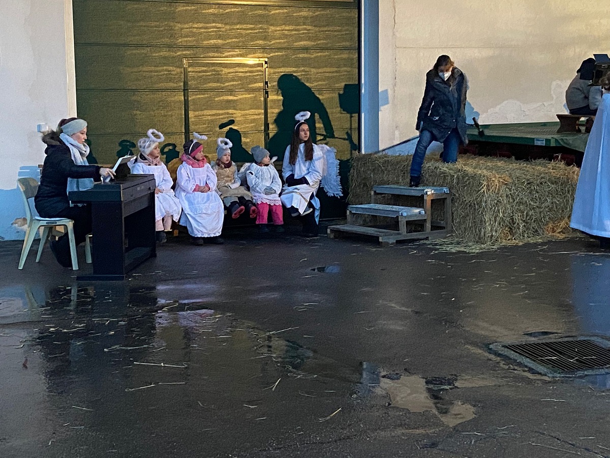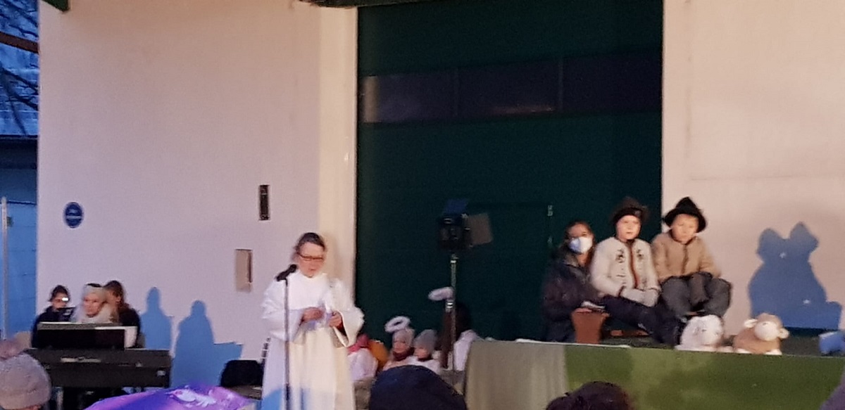 Patoralreferentin Susanne Deininger war gewohnt routiniert bei der Planung und Umsetzung des Krippenspiels, trotz weniger zur Verfügung stehender Kinder dieses Jahr und der wenigen Proben, die abgehalten werden konnten.